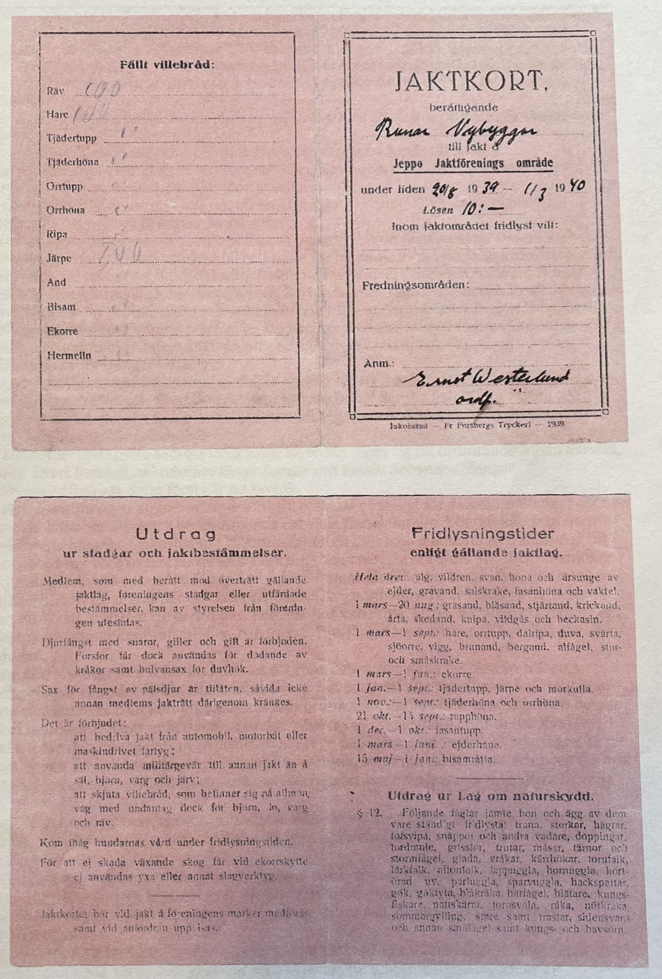 Nedan en bild av Runar Nybyggars jaktkort 1940: