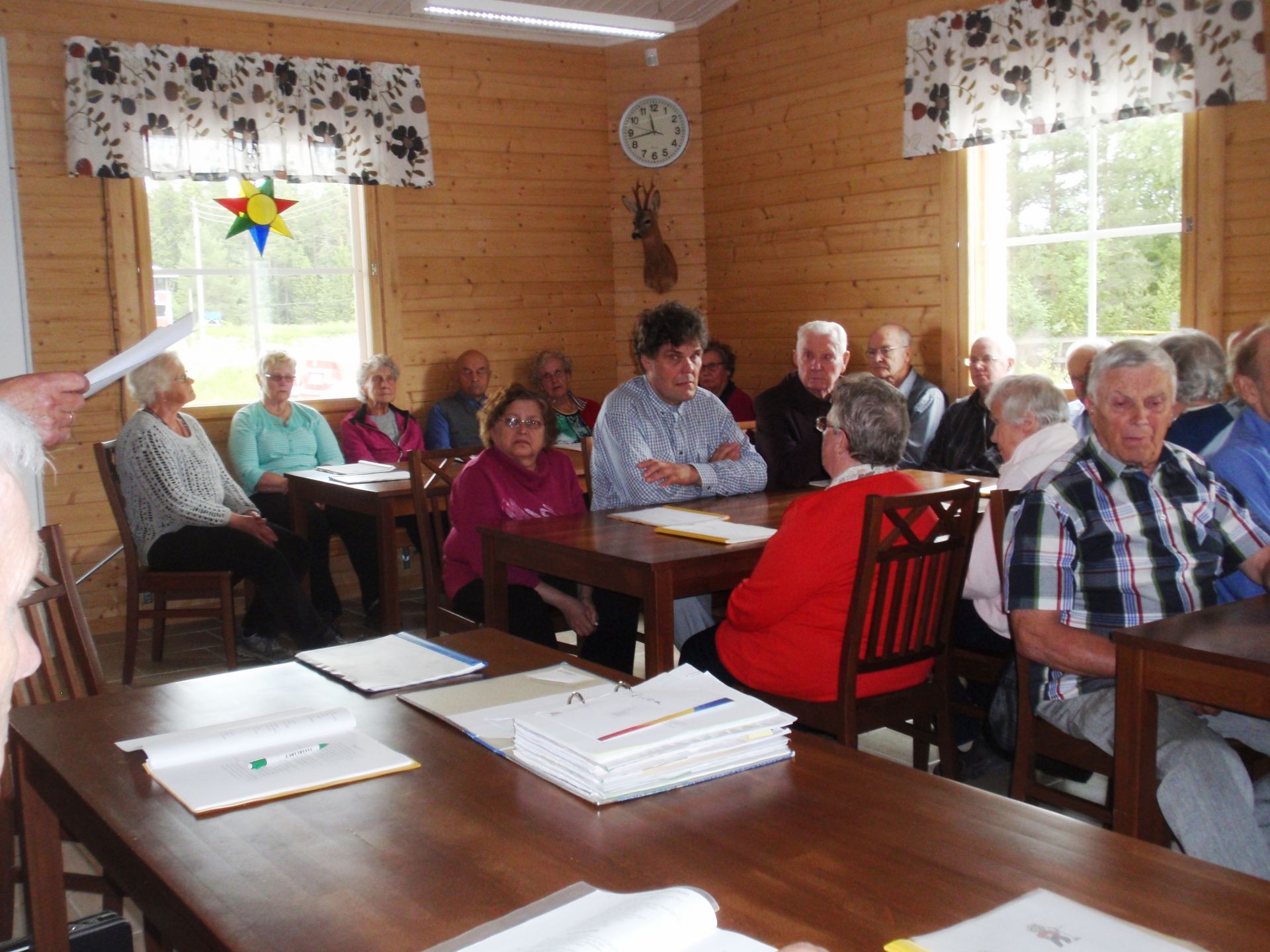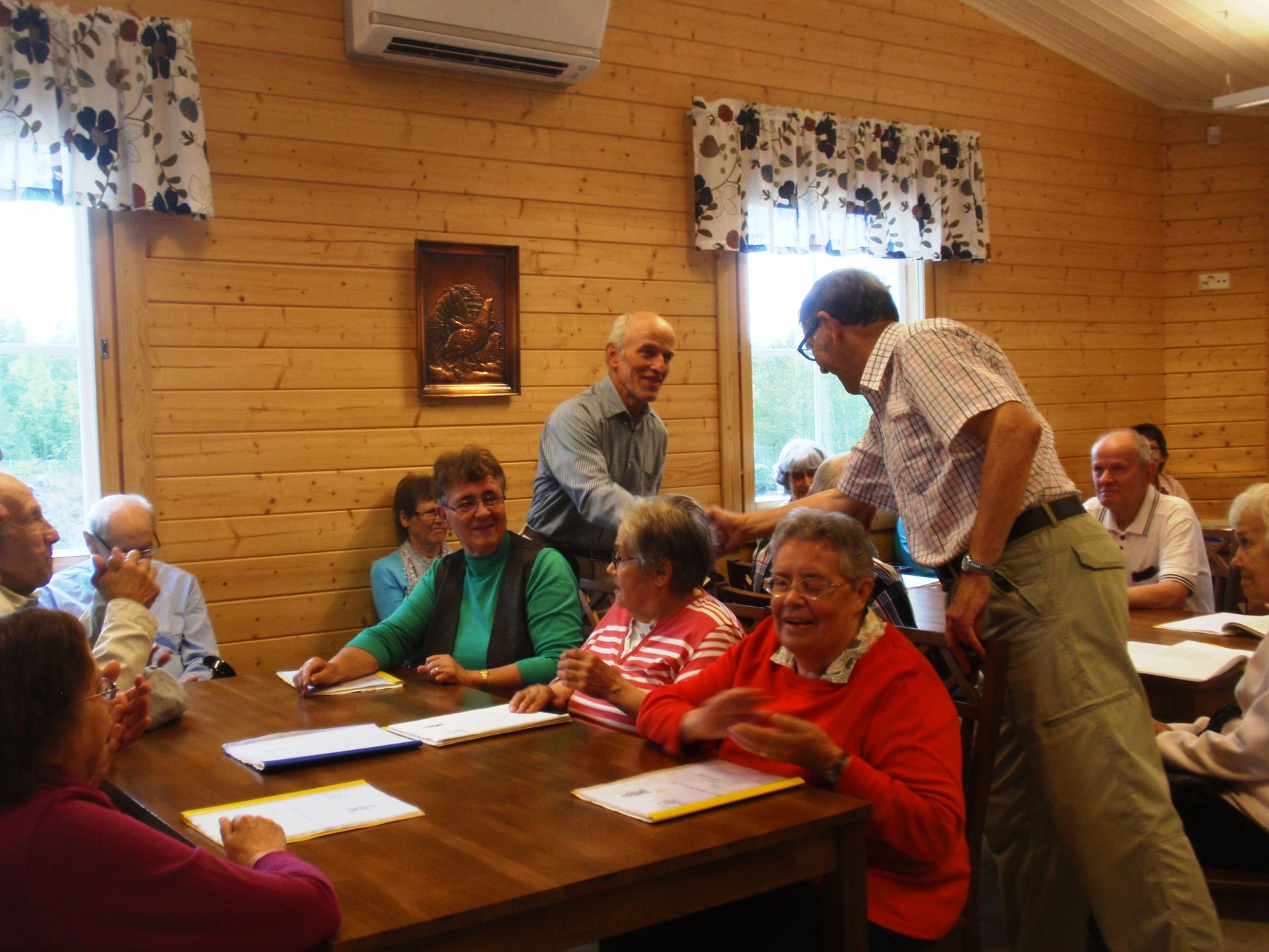 Man samlades på nytt inne för att sjunga samt förrätta prisutdelning med överräckande av plakett som ordförande gjort, till vinnarna i pilkastning Margareta Nybyggar i damklassen och Christer Fors i herrklassen. Naturstigens vinnare blev Margareta Nybyggar, Dorita Jungarå samt Gudrun Julin med samma antal rätta svar, de fick ett diplom samt ett wienerbröd. Så avslutades friluftsdagen med allsången Nu går sista visan. Alla var nöjda och glada efter trevlig träff.