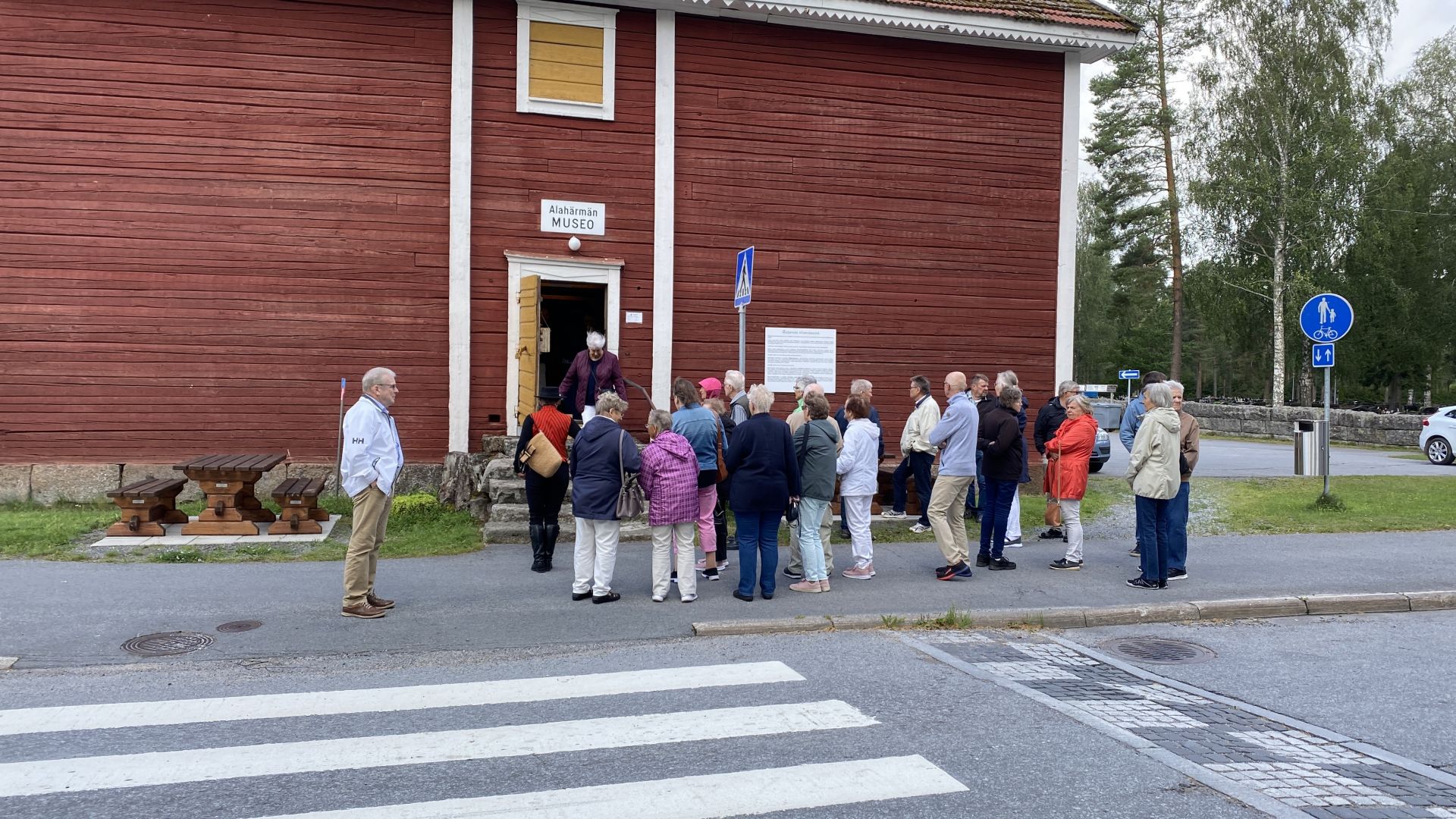 Första anhalten på resan var Alahärmän kotiseutumuseo (Alahärmä hembygdsmuseum). Eftersom vi var så många ville våra guider att vi skulle dela upp oss i två lika stora grupper. Ena gruppen skulle börja i kyrkan och den andra i museet. Hur det kom sig ville många till kyrkan först, så grupperna blev olika stora. Men det löste sig, blev kanske lite trångt i museet, men stenkyrkan från 1904 rymmer 900 personer, så där var det ingen nöd. Den första kyrkan av trä byggdes 1676, men blev för liten. Den andra träkyrkan byggdes 1752, men förstördes av elden sommaren 1898. Den nuvarande kyrkan, planerad av arkitekten Josef Stenbäck, är således den tredje på samma plats. Kyrkan är mycket vacker, och det var ganska många som inte hade besökt den förut.