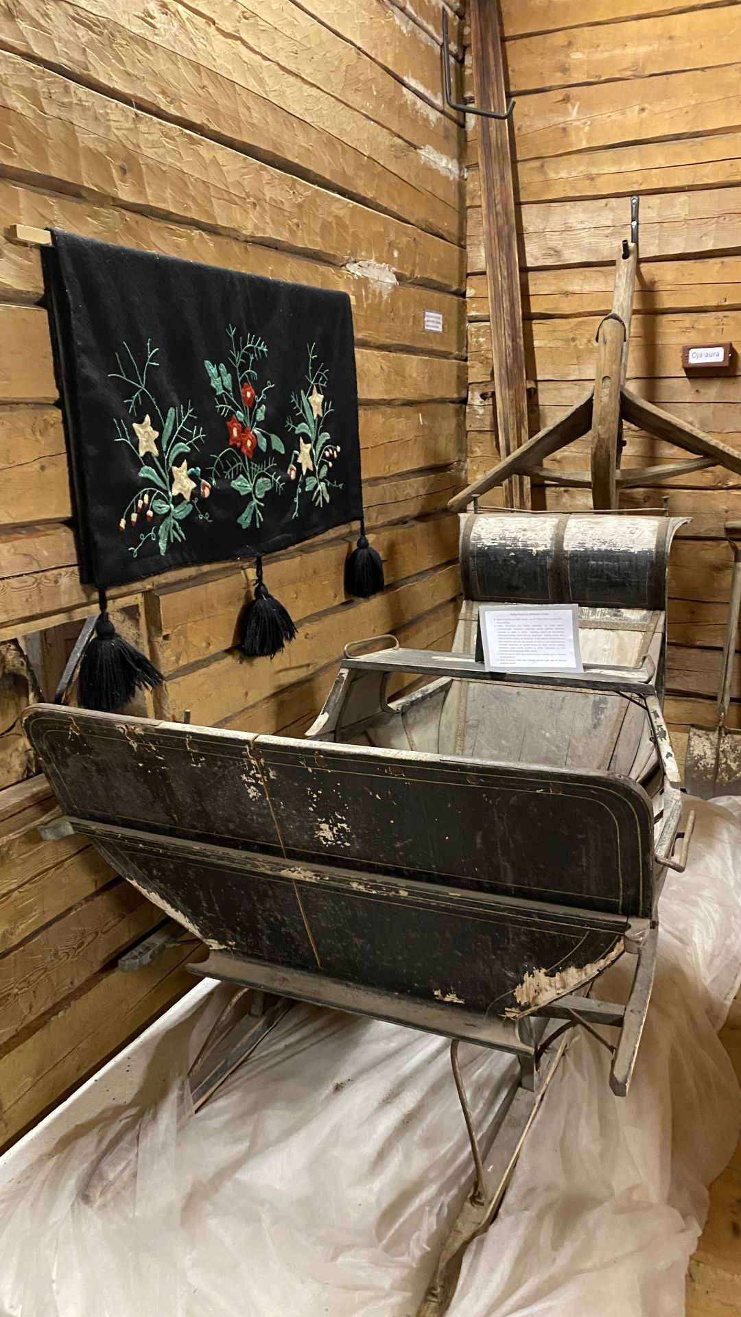 Lägg gärna märke till den fina textilen som hänger på väggen och hör ihop med slädfärden.