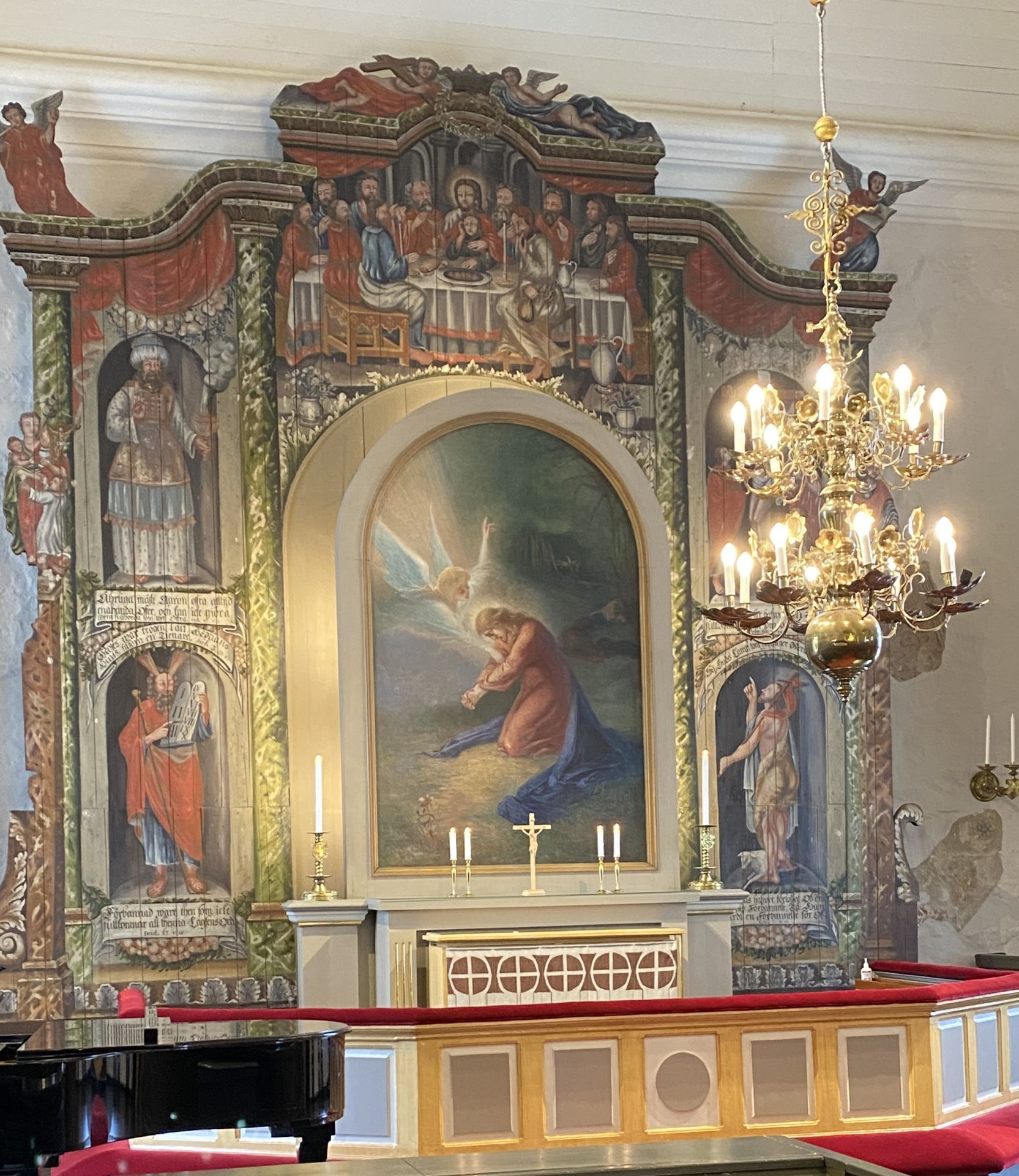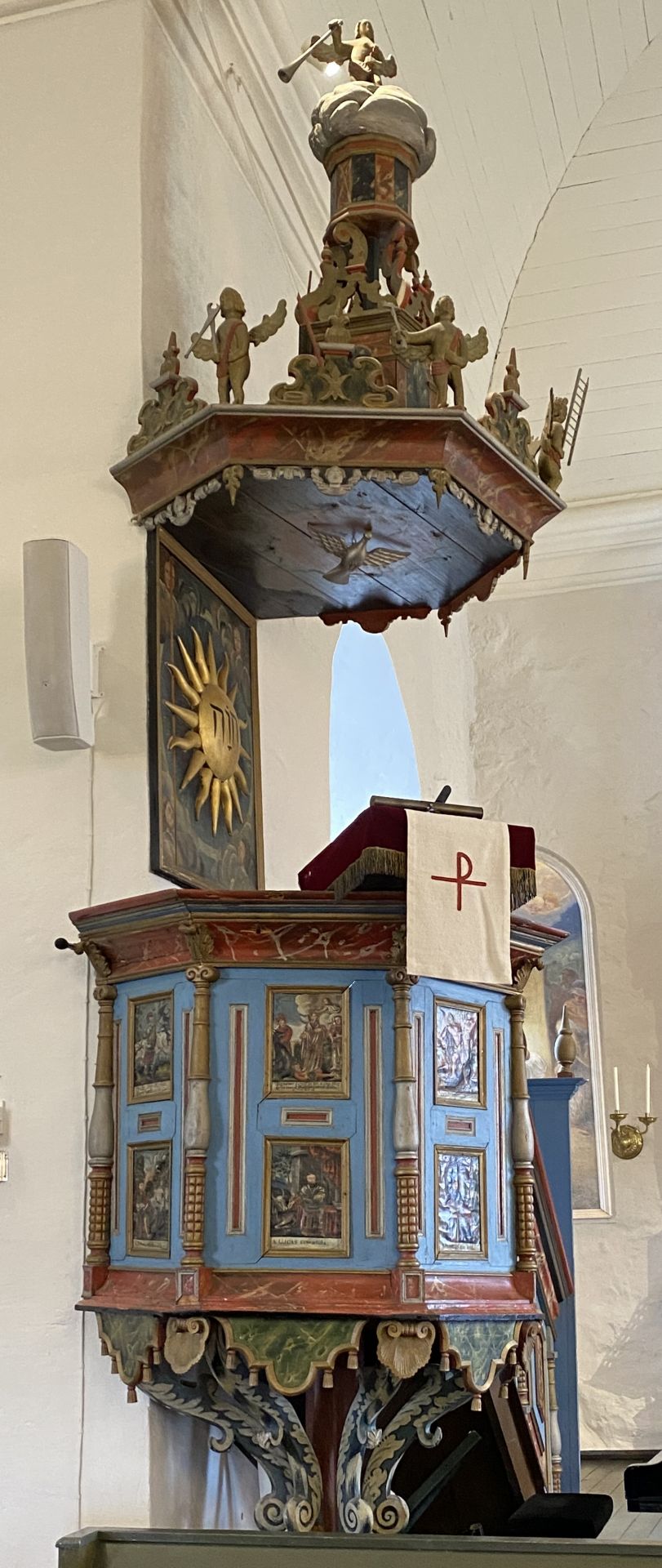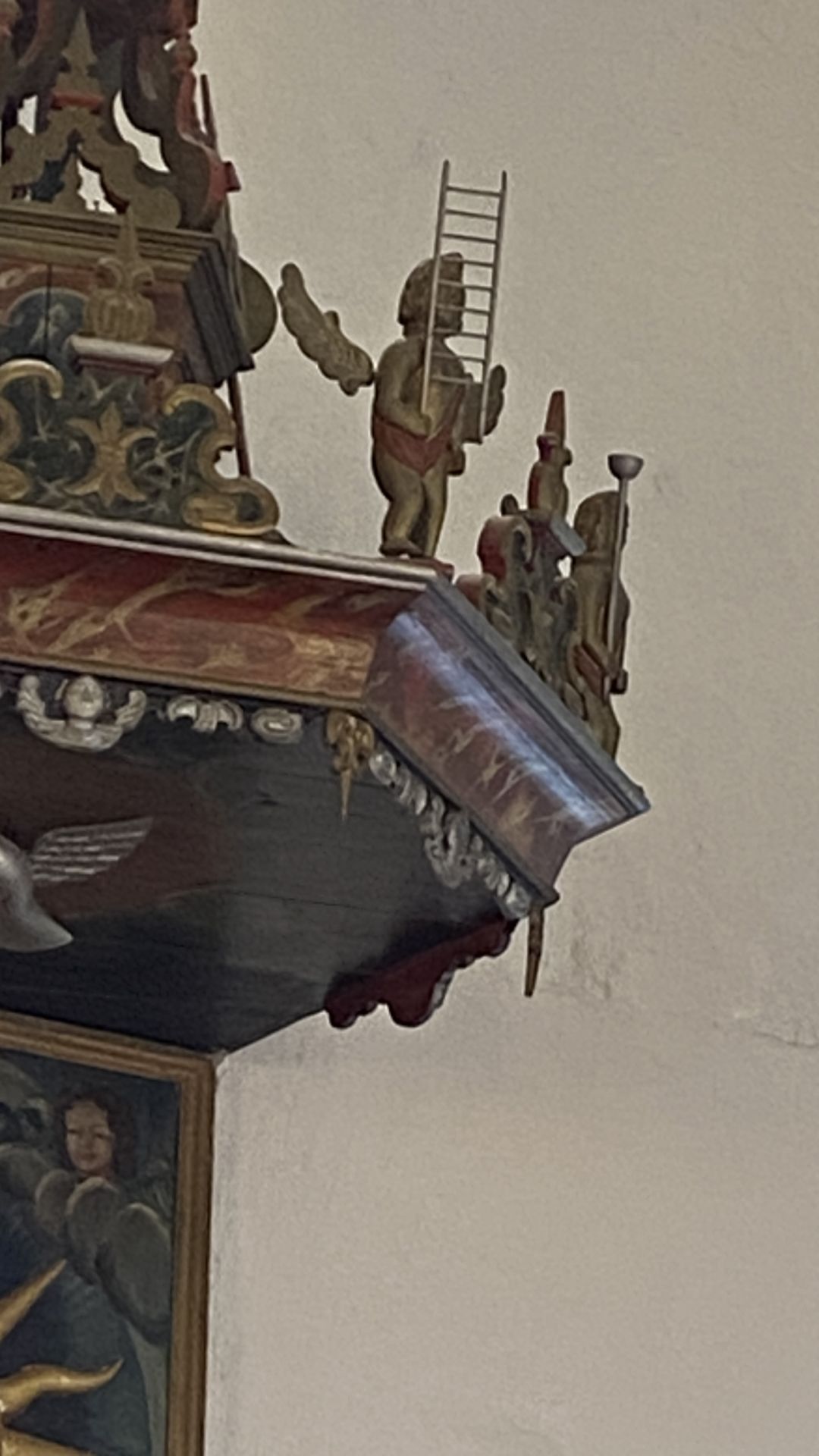 Predikstolen är rik på detaljer och målningar. Är det Jakobs stege vi ser?