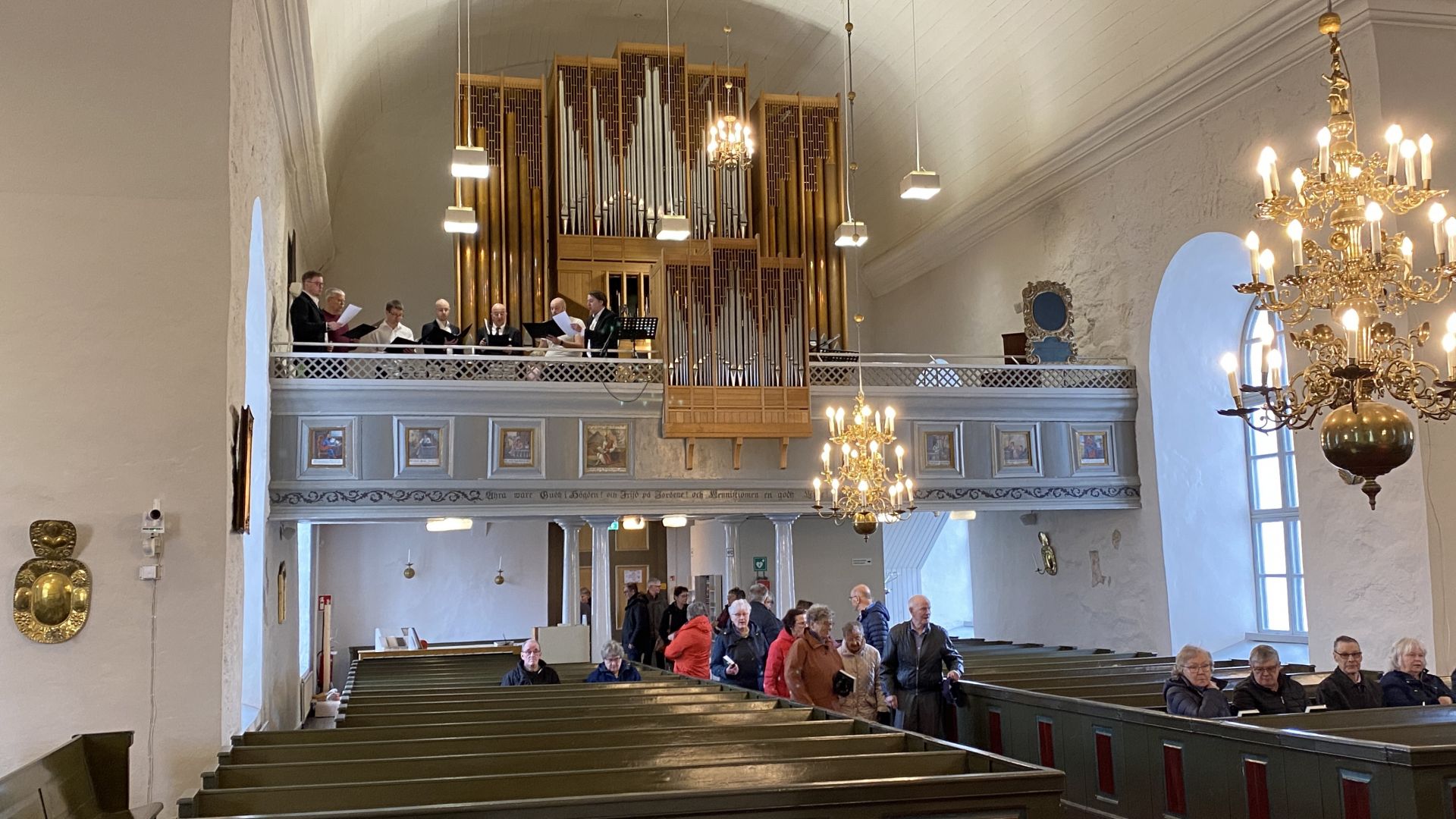 När vi kom in i själva kyrksalen möttes vi av orgelmusik och sång. Kantorerna Martti Laitinen och Hannes Uunila var i tjänst, och likaså en sånggrupp, 7 män stark, som övade. De skulle sedan bidra med kraftigt stöd åt församlingssången. Som svar mellan textläsningarna fick vi höra dagens psaltarpsalm, sjungen enligt sedvanlig psalmton av sånggruppen. Som postludium spelade Hannes Uunila ett stycke av Franz Liszt. Verk av honom hör man inte så ofta spelas på orgel.
